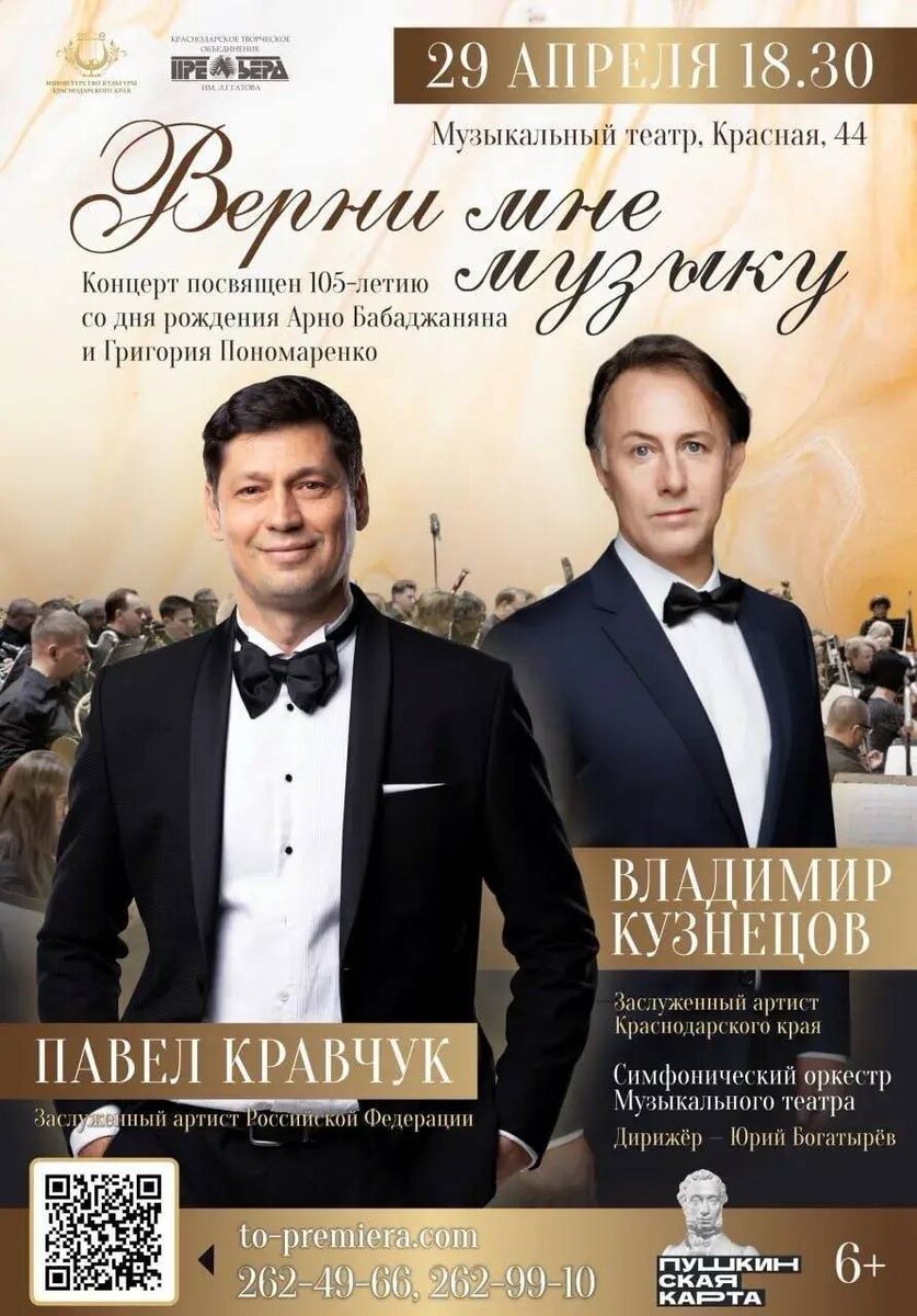 🎼 Друзья, хотим поделиться с вами прекрасной новостью: 29 апреля в 18.30 на сцене Музыкального театра состоится особый концертный вечер, посвящённый 105-летию двух великих композиторов — Арно Бабаджаняна и Григория Пономаренко. В этот вечер прозвучат признанные музыкальные шедевры, исполненные профессионалами: 🎶Заслуженным артистом России Павлом Кравчуком 🎶Заслуженным артистом Краснодарского края Владимиром Кузнецовым 🎶Монументальное звучание симфонического оркестра под руководством Юрия Богатырёва создаст атмосферу настоящего триумфа музыки. 💫Особенностью этого концерта станет выступление народной артистки России — Вероники Журавлёвой-Пономаренко. Для неё это важный момент, ведь именно она сохраняет и продолжает наследие выдающегося композитора.