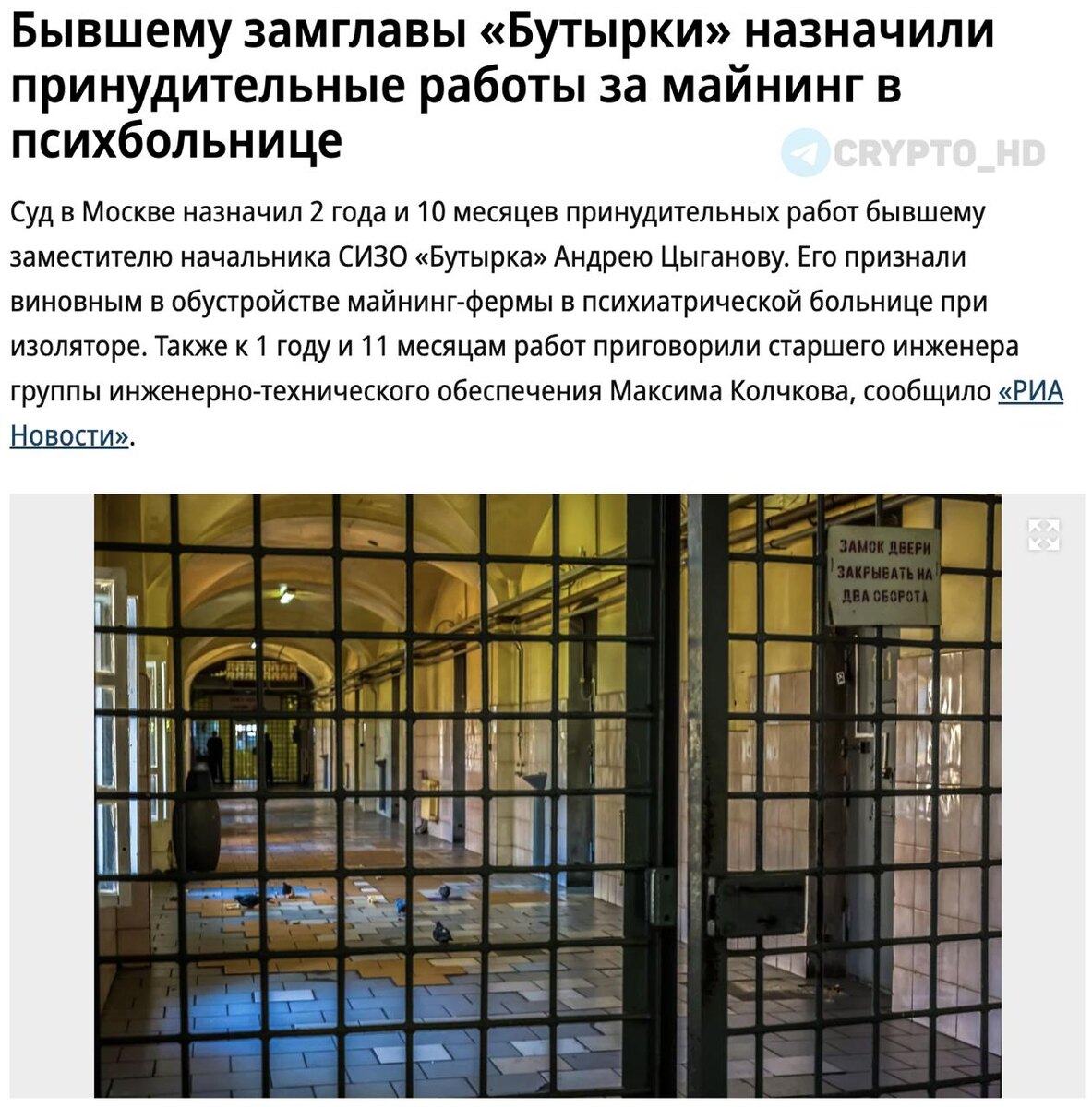 В Москве бывшему замглавы «Бутырки» дали 2 года и 10 месяцев принудительных работ за организацию майнинг-фермы… в психбольнице при изоляторе. ➤ Ферму развернули в техническом помещении и майнили BTC за счет электричества учреждения. ➤ В схеме также участвовал инженер – ему дали 1 год и 11 месяцев принудительных работ. ➤ Ущерб пока не раскрыт, но его обязали компенсировать. ➤ Прокуратура просила реальные сроки, но суд ограничился принудительными работами. Crypto Headlines