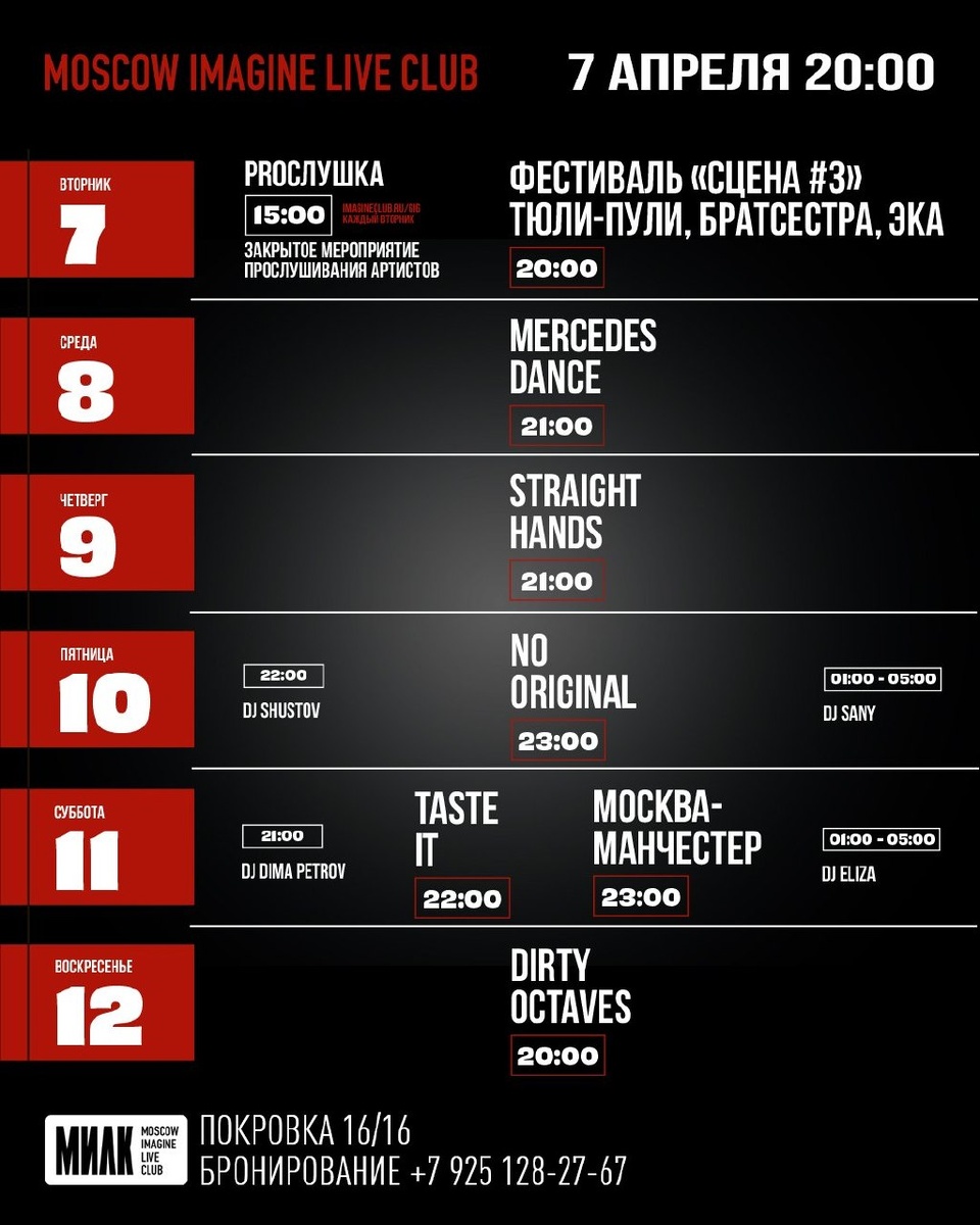 Три абсолютно разные группы, три подхода к музыке — звучит почти так же хорошо, как напоминание о том, что мы наливаем бесплатно каждый третий напиток в пятницу и субботу, но после концерта. Сегодня начинаем в 20:00 — вход свободный. На сцене «Тюли-Пули», «Братсестра» и «Эка». Мы начали монтировать летнюю веранду, несмотря на то, что финансовая ситуация у клуба очень тяжелая. Поэтому мы даем оооочень хорошие скидки на кейтеринг и банкеты. Конечно, при условии внесения предоплаты. Звоните, договоримся! Вопросы и бронирования по телефону +7 (925) 128-27-67 или на сайте imaginecafe.ru