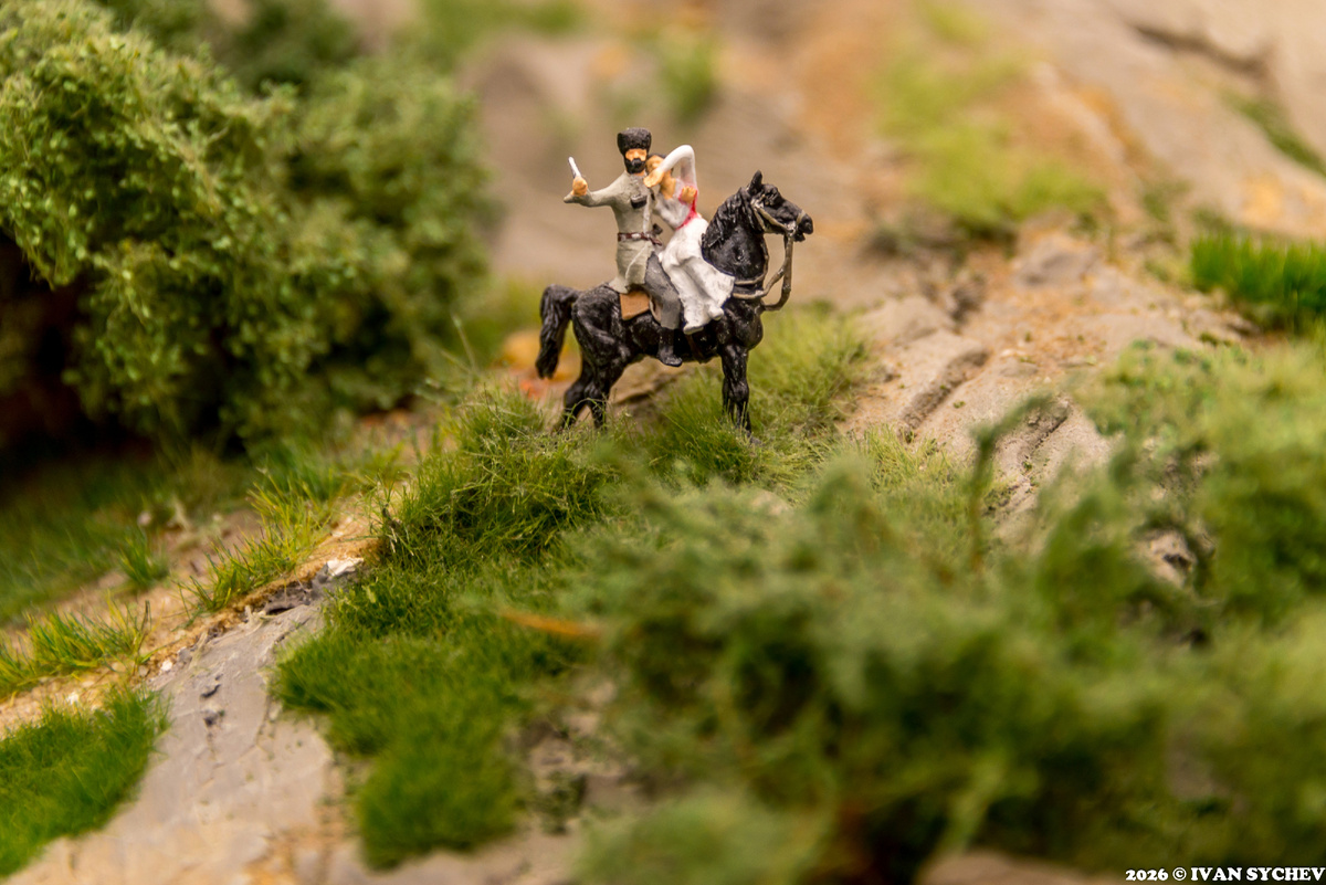 Всех, кто хочет мне поставить на вид, что вот именно эти вот пасхалки (т.е. ситуации, которые добавляют юмора и неожиданностей, при этом с первого раза незаметны) давно всем известны – вот очень прошу успокоиться и держать себя в руках. Да, быть может, нового я не открою, но это те самые фрагменты макета, которые лично я увидел на нем впервые. Может быть, они новые в принципе, может быть были с самого его открытия – не скажу, да и не буду гадать. Просто покажу, то, что я сумел увидеть и сфотографировать. 1. В горах Кавказа вот такой джигит украл невесту. Не думаю, что сейчас (а макет все же про сейчас, а не с уклоном в историю) где-то высоко-высоко в горах практикуется этот обычай. Хотя все может быть, все может быть… 2. Там же, можно сказать на соседней вершине, обнаружился вот этот человек в явно военном обмундировании времен начала XIX века. Предположу, что раз Кавказ и «мужик в пиджаке» - то это Лермонтов, хотя сходства найти здесь почти невозможно. Впрочем, о каком сходстве может
