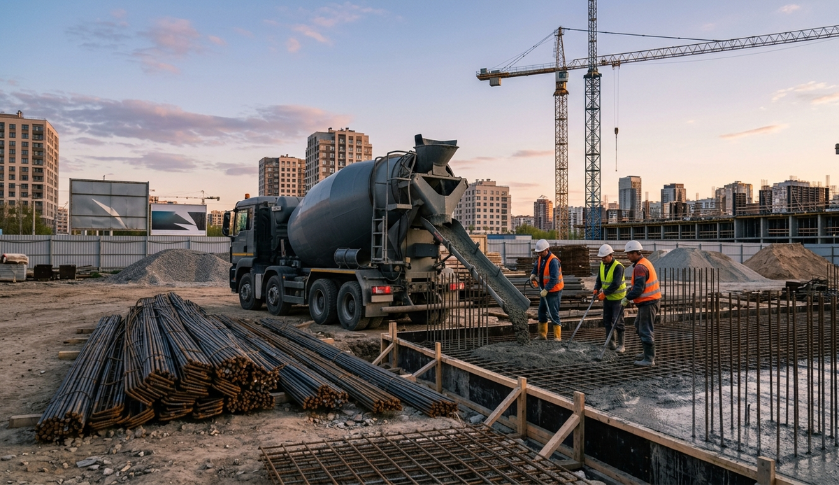 Динамика стоимости строительных материалов в 2026 году сохранит восходящий тренд. Согласно экспертному анализу, ожидаемое удорожание ключевых позиций — бетона и арматуры — составит от 10% до 20%. Это не случайное колебание рынка, а результат влияния фундаментальных факторов, которые частным застройщикам и подрядчикам стоит учитывать уже сейчас при планировании бюджета. Для бетонных смесей прогнозируется рост в диапазоне 10–20%. Основной причиной является регулярное повышение стоимости входящего сырья: цемента, щебня и песка. Также на конечную цену за кубометр (м³) существенно влияет логистика. Содержание парка спецтехники — автобетоносмесителей (АБС) и бетононасосов — дорожает из-за роста цен на запчасти и техническое обслуживание, что производители вынуждены закладывать в себестоимость продукции. Ситуация с металлопрокатом традиционно характеризуется волатильностью, однако среднегодовой прогноз для арматуры указывает на рост в пределах 5–15%. Несмотря на возможные кратковременные пери