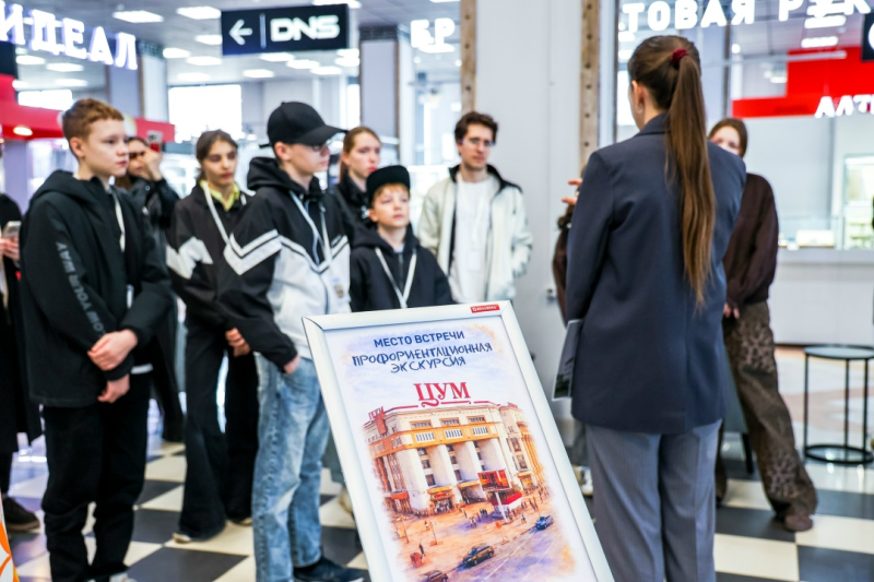 31 марта для старшеклассников – детей сотрудников нижегородских предприятий «Маринс Групп» – прошла профориентационная экскурсия по торговому центру «ЦУМ», богатая история которого ведётся с 1954 года. Это уже вторая встреча в рамках цикла профориентирующих мероприятий (до этого ребята уже знакомились с отелем Marins Нижний Новгород), цель которых – не просто рассказать о профессиях, а показать работу предприятий изнутри: познакомить с сотрудниками, чья компетентность, внимание к деталям, ответственность и вовлечённость создают пространство, в которое хочется возвращаться. Здание ЦУМа является объектом культурного наследия, поэтому утро школьников началось с истории. Ребята узнали, как формировался облик здания, почему район называется Канавинским, как с этим местом связан Царский павильон и какое отношение к истории района имеют Максим Горький и Владимир Даль. Экскурсию дополнили архивные фотографии, часть из которых представлена прямо в пространстве торгового центра. Затем участники
