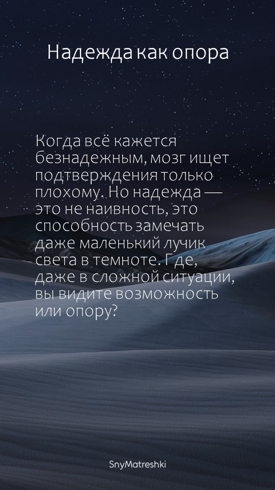 В повседневной суете мы часто теряем контакт с тем, что чувствуем и о чём на самом деле думаем. Эта рубрика — короткие напоминания, которые помогают остановиться и прислушаться к себе. Здесь нет готовых решений, только повод заглянуть внутрь и задать честный вопрос. Читайте, делайте паузу, дышите. И пусть каждый день будет чуть ближе к вам настоящему. Поддержать автора Александра Бóгдан,
