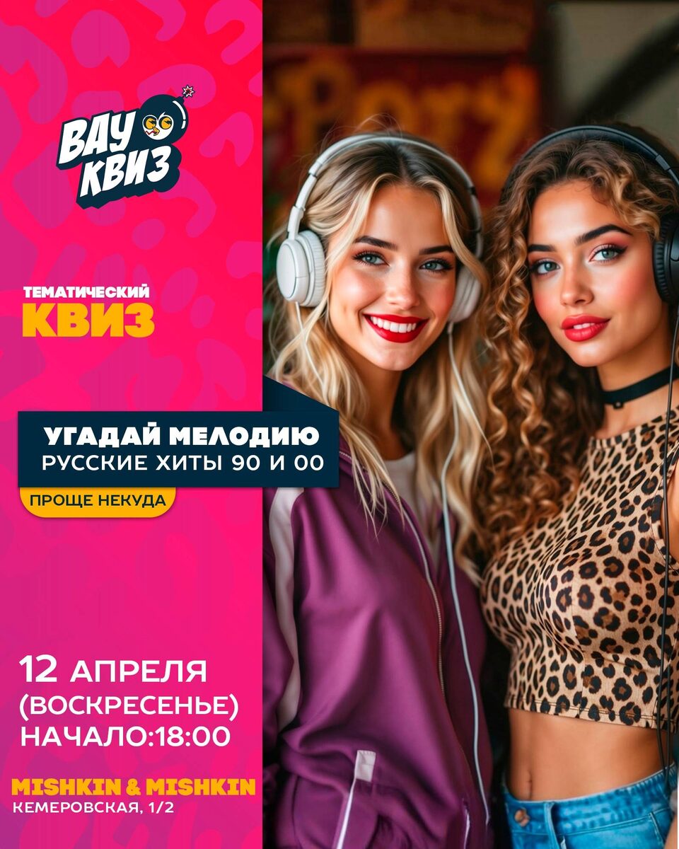 Музыкальная игра с ностальгическими хитами прошлого. Участники угадывают мелодии, вспоминают культовые группы и клипы, играют в различные туры и механики. Начало: 12 апреля 2026 18:00 Стоимость: Не указана Адрес: г Омск, ул Кемеровская, д 1/2 Организатор: https://vk.com/public227484875 🎶12 апреля (Воскресенье). Начало: 18:00 - Угадай мелодию. Русские хиты 90-х и 00-х. Проще некуда. Играем в «Mishkin & Mishkin» (Кемеровская, 1/2). Помните, как выбирали кассету, чтобы можно было стереть ненужный фильм и записать любимый хит, а потом ждали клипа по MTV? Самые узнаваемые хиты прошлого в одной игре — это настоящий подарок для прежних нас 🥰 Нас ждёт 10 туров чистого музыкального кайфа. После узнаваемых вступлений попадем в весенний тур с самыми теплыми хитами. Услышим... #познавательное_развлечение_квиз Узнать подробности, адрес или записаться на событие.