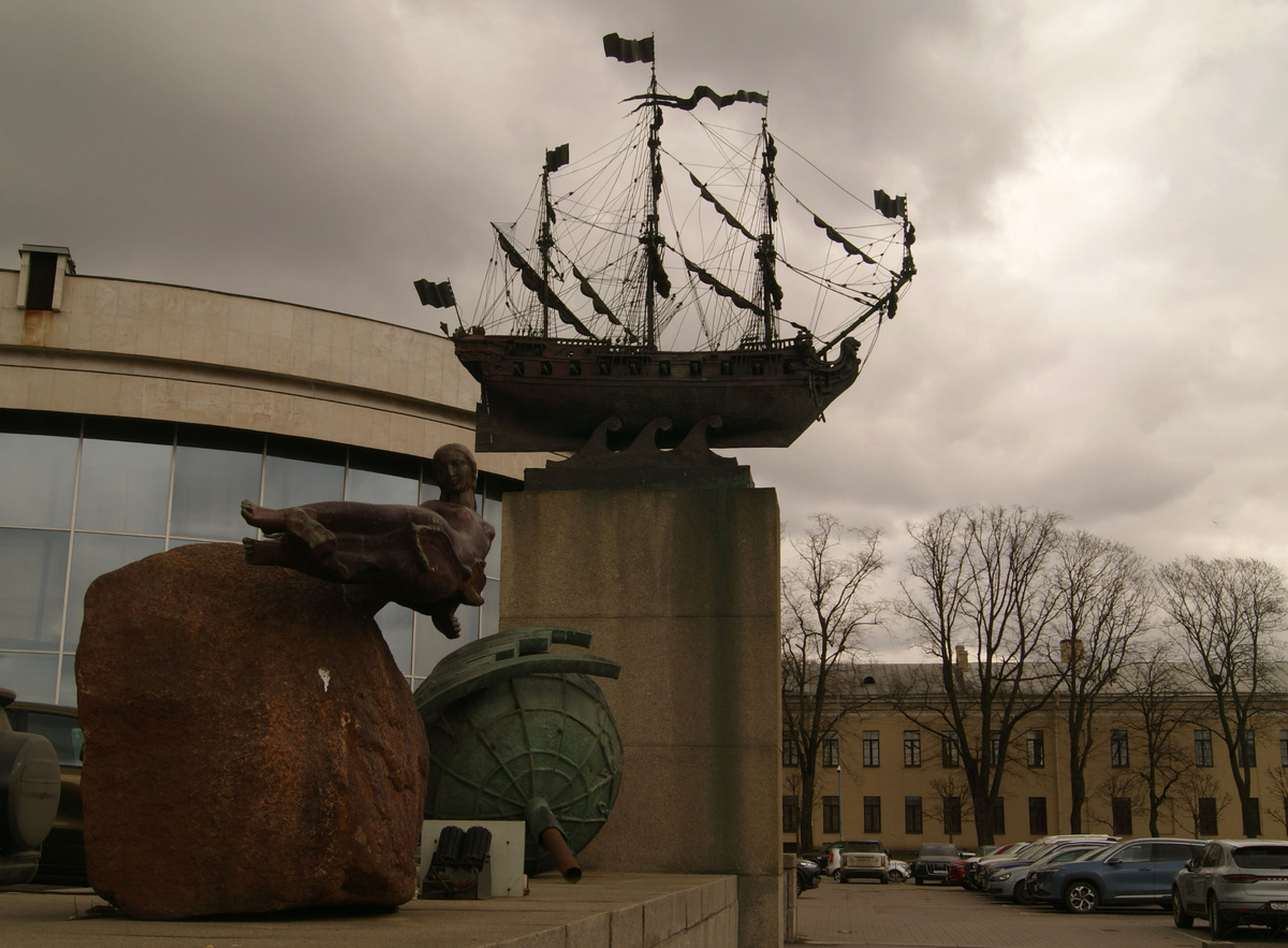 Памятный знак Фрегату "Крейсер" у гостиницы Санкт Петербург (ранее Ленинград). Анатолий Гордеевич Дёма 1973 год. Фрегат "Крейсер" - уменьшенная в 15 раз копия корабля, на котором будущий адмирал, капитан-лейтенант Михаил Петрович Лазарев совершил кругосветное путешествие в 1822-1824 годах. На «Крейсере» в свое время ходили: мичман Павел Степанович Нахимов, впоследствии знаменитый флотоводец и герой обороны Севастополя; мичман Ефим Васильевич Путятин, впоследствии известный мореплаватель и дипломат, лейтенант Федор Гаврилович Вишневский, впоследствии декабрист, и мичман Дмитрий Иринархович Завалишин (до Русской Америки), впоследствии декабрист, лейтенант Михаил Дмитриевич Анненков (ум. 1839), лейтенант Иван Антонович Купреянов, впоследствии вице-адмирал; мичман А. А. Домашенко, 9 сентября 1827 года погибший при спасении тонущего товарища, в 1828 году ему был установлен памятник в Кронтадте, сохранившийся до настоящего времени; мичман Иван Петрович Бутенев, впоследствии герой Наваринско