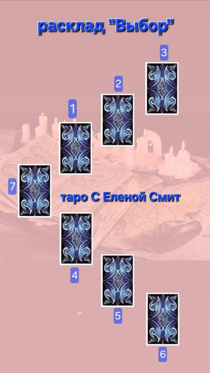 Расклад «Выбор», довольно простой и информативный. Этот расклад позволяет выяснить какая перспектива вас ждет на том или ином пути. 7 – сигнификатор дает наглядное представление о подоплеке вопроса, о некой проблеме или даже о том, как спрашивающий относиться к решению. 1,2,3 – это последовательность событий в хронологическом порядке, указывает что случиться, если вы поступите Х 4,5, 6 - это последовательность событий в хронологическом порядке, указывает что случиться, если вы поступите Y 1 и 4 карты которые показывают с чего начнется развитие событий 3 и 6 во что всё выльется. Не следует задавать вопросы: «Что будет если я разведусь и что будет если я не разведусь», «Что будет если я куплю машину и что будет если я не куплю машину (квартиру) и тд». Лучше задавать вопросы так: «Мои перспективы на работе Х и мои перспективы на работе Y». «Как будут складываться обстоятельства, в загаданный период, если я перееду в город Х и в город Y», «Если я приму решение Х что я получу и что я получу
