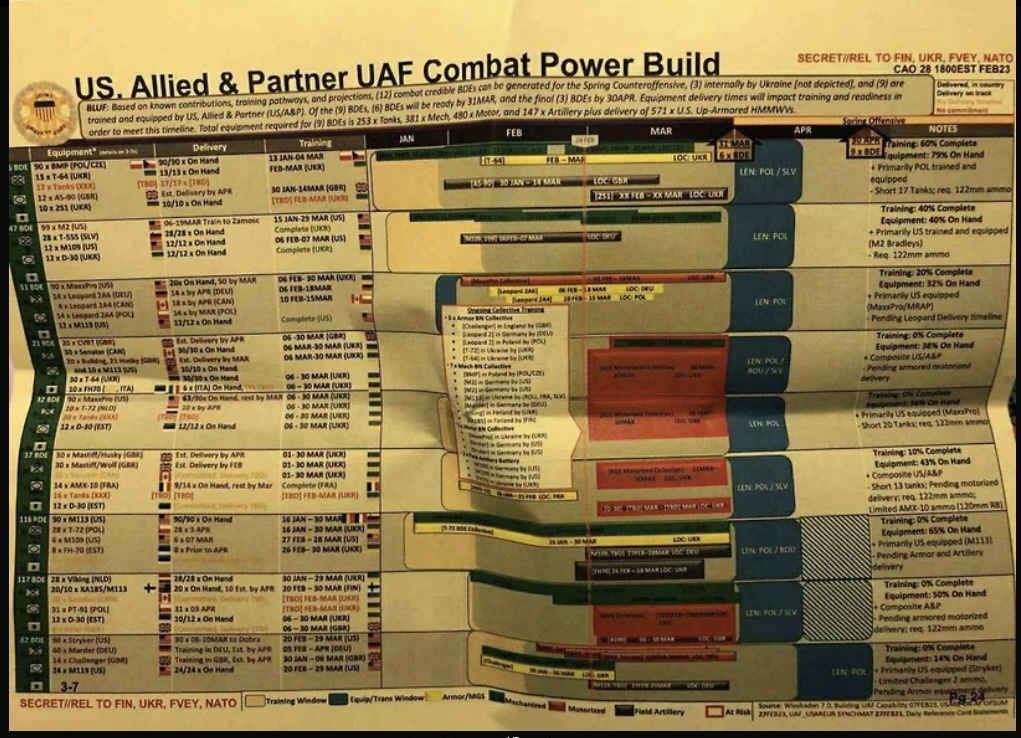 В файлах говорится, что половина — 6 из 12 боевых групп украинских военных, обучающихся в США и других странах НАТО, должны были закончить обучение к началу апреля. Ещё три бригады должны завершить курс повышения квалификации к началу мая. Численность каждой из этих боевых групп достигает 5 тыс. человек.