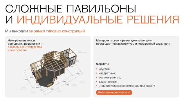 Это главная новинка сезона. Мы сделали арендные павильоны нового поколения: И главное: снижение цены на 25% без потери качества продукции. Достигнуто за счёт унификации конструкции. Новые форматы и функциональность Улучшения, которые вы оцените Сайт и конструктор — больше возможностей