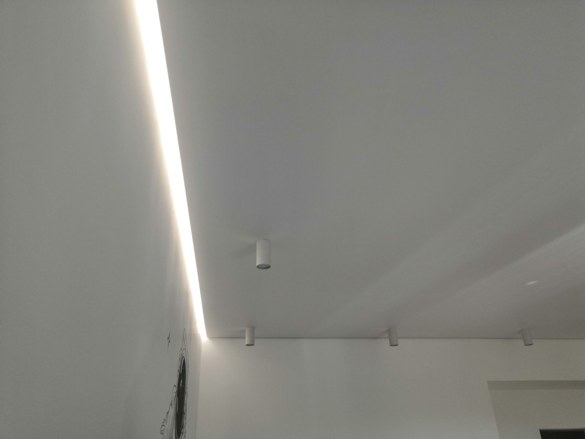 В парящей конструкции всё иначе. Ниша и зазор между стеной и полотном — это то, на что смотрит глаз. Световая лента внутри ниши подсвечивает всё изнутри, и любая неровность в зоне ниши читается как неравномерность светового потока: где стена ближе к профилю — ниша уже, свет там темнее. Где стена отходит — ниша шире, там светлее. На потолке это выглядит как пятнистое, пульсирующее свечение вместо ровного ореола.