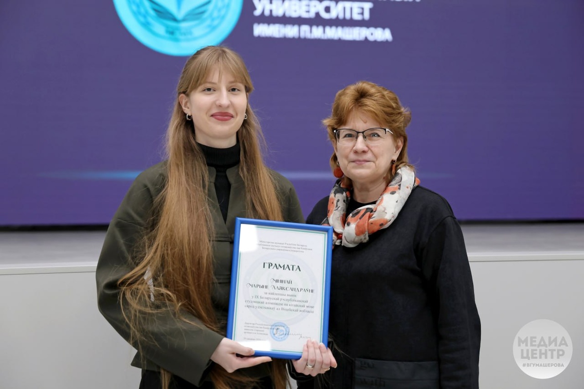 М. Машерова прошло награждение победителей республиканских конкурсов. Проректор по учебной работе Мирослава Бобрик вручила ребятам заслуженные дипломы. 🔵Студентка факультета гуманитарного знания и коммуникаций Минина Марина награждена грамотой «За лучший результат среди участников Витебской области» IX Белорусской республиканской студенческой олимпиады по китайскому языку. 🔵Проект Витебского государственного университета имени П.М. Машерова стал победителем республиканского конкурса «Блогосфера 7.0» в номинации «Неочевидная Беларусь» (авторы: Руслан Стельмах, студент факультета гуманитарного знания и коммуникаций, и Александр Гергаев, начальник отдела медиакоммуникаций). #новости