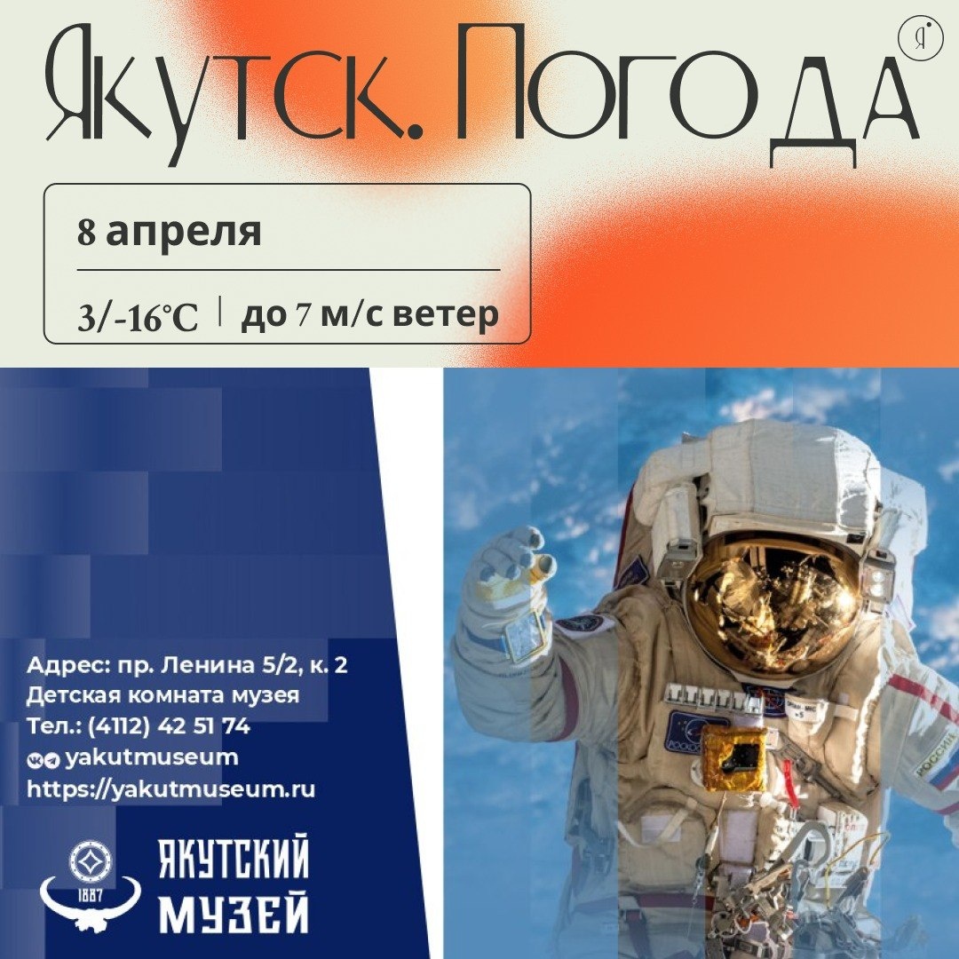 🌌 Неделя приурочена к 65-летию первого полёта человека в космос. Ребят ждут мультфильмы, игры и увлекательные занятия о космосе и его героях 🌠 Программа: 🌙 8 апреля (среда) 11:00 - музейное занятие «Герои космоса» (200 руб. с одного школьника) 15:00 - показ мультфильма «Белка и Стрелка: Лунные приключения» ⭐️ 9 апреля (четверг) 11:00 - показ мультфильма «Тайна третьей планеты» 15:00 - музейное занятие «Герои космоса» (200 руб. с одного школьника) 🚀 10 апреля (пятница) 12:00 / 15:00 - музейное занятие «Герои космоса»(200 руб. с одного школьника) 📍 Детская комната музея (1 этаж Главного корпуса) 📞 Запись: (4112) 42-51-74 Online Якутия | Ждем вас в МАХ