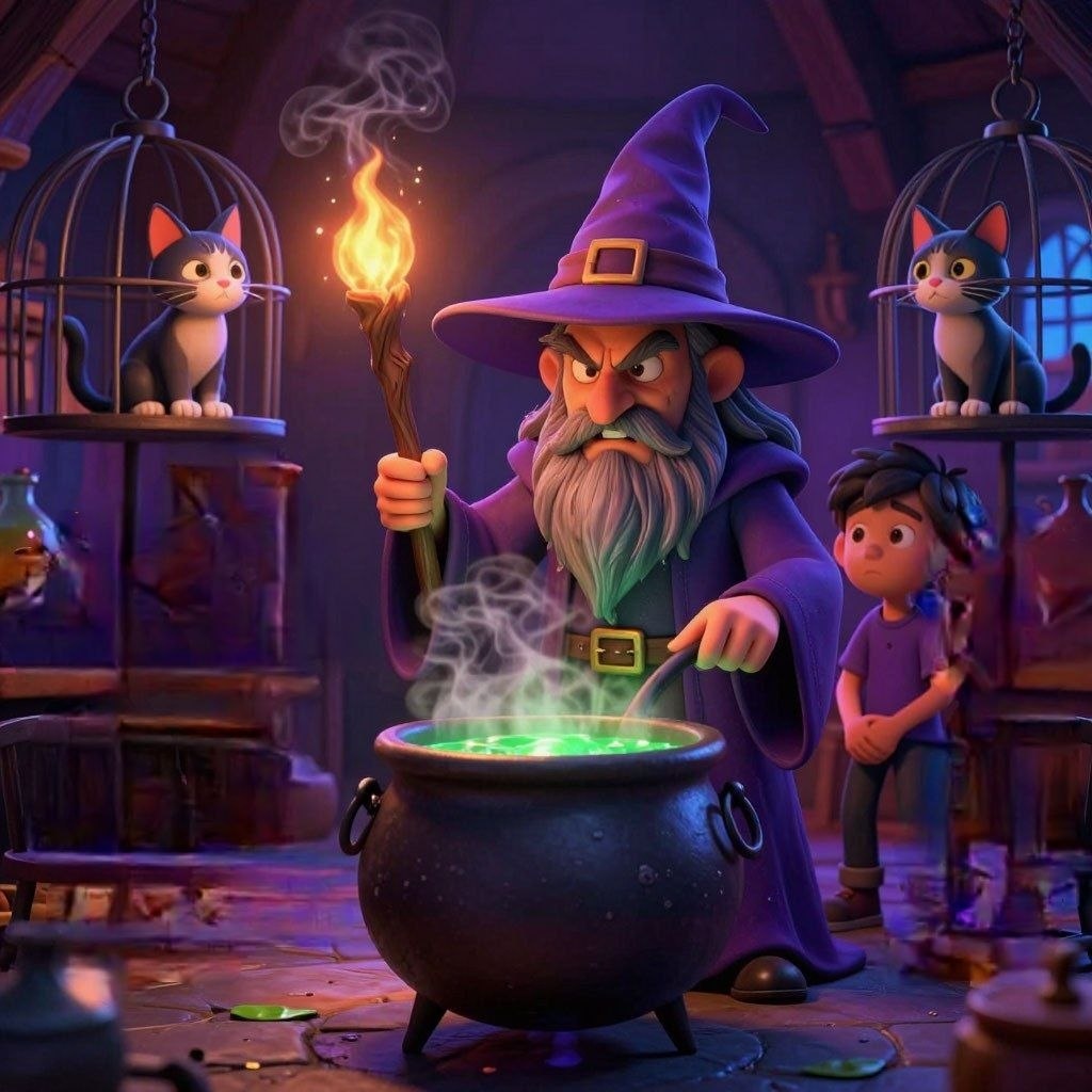 Пока маг разбирался с эликсирами, Влад осторожно подсыпал в котёл шипучий песок, который подарила ему баба Таня на случай опасности. Затем быстро спрятался за дверью.