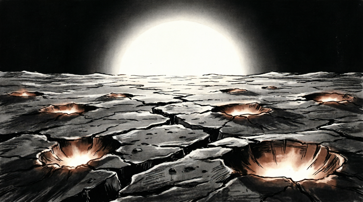 На поверхности планеты — тысячи бледных, бесформенных углублений. Не кратеры: у них нет валов и лучей выброса. Не вулканы, потому что нет жерл и потоков. Они похожи на неровные дыры, словно кто-то выел поверхность ложкой.