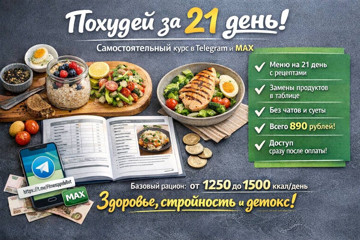 Вы проходите программу в удобное время, без привязки к датам. Внутри курса: — подробное меню с граммовками — доступные продукты — рецепты и варианты замен — сбалансированная калорийность для запуска обмена веществ Курс проходит в Telegram и MAX. Доступ открывается сразу после оплаты. Без чатов и лишнего отвлечения — вы спокойно идёте к своему результату. Стоимость участия — 890 рублей. Начать можно уже сегодня: Telegram -> https://t.me/FitnessppedaBot?start=sub166331 MAX -> https://max.ru/id343606860606_bot