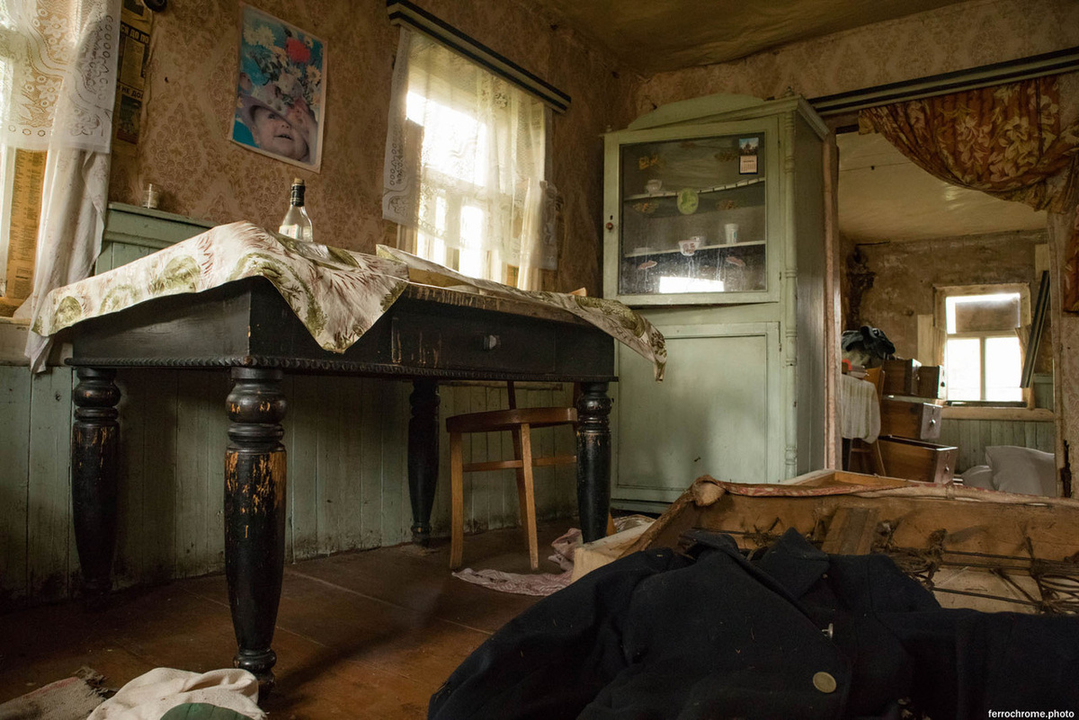 А что сегодня? Сегодня здесь - заросшая травами единственная улица, электричество обрезано, а из жителей не осталось никого. Больше всего нас удивил один дом - он выглядел так, как будто люди ушли совсем недавно. Здесь всё осталось на своих местах - антикварный стол занимает почётное место в комнате, а буфеты и шкафы наполнены посудой и одеждой. На полках выстроены ряды книг, на стенах висят картины и календари, и поздравления бабушке от 1991 года.