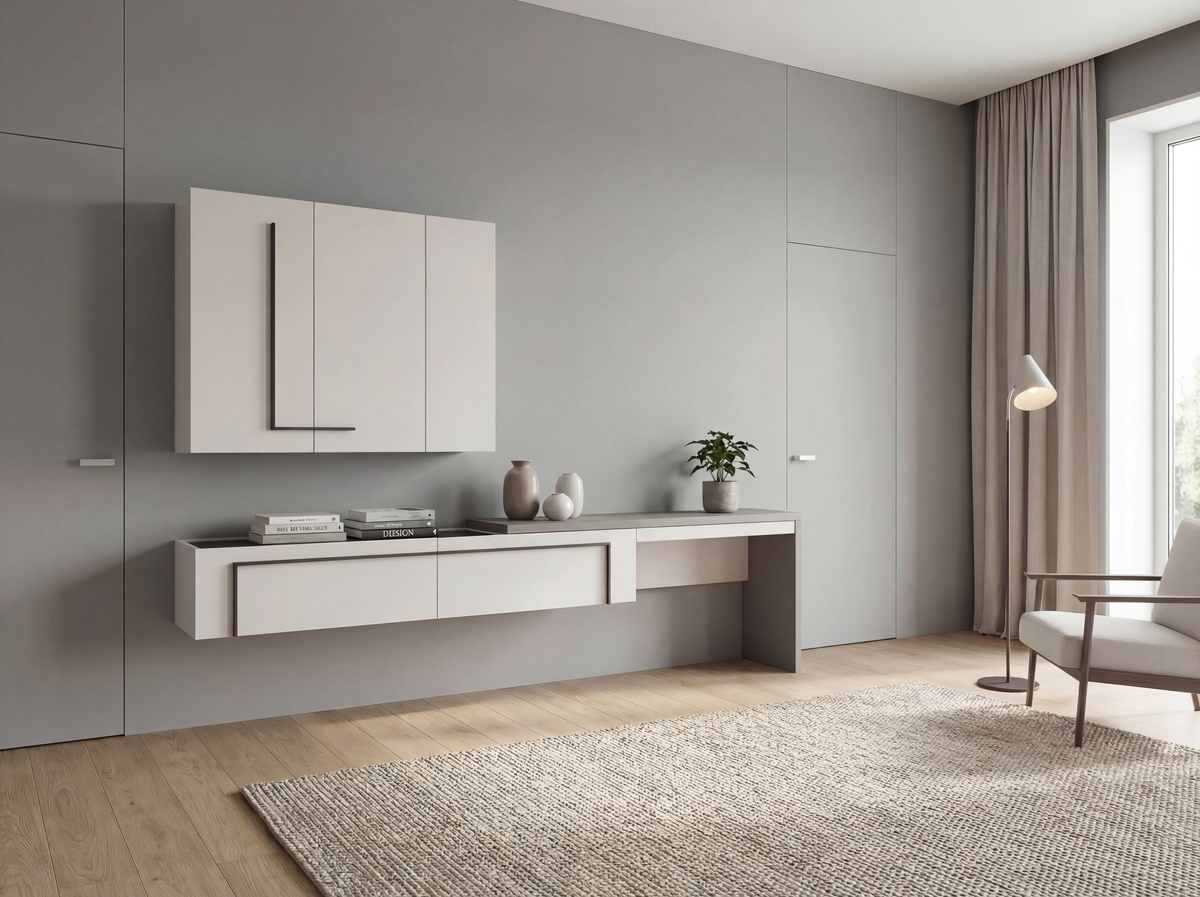 Черты: Чёткие линии, функциональная мебель, скрытые системы хранения