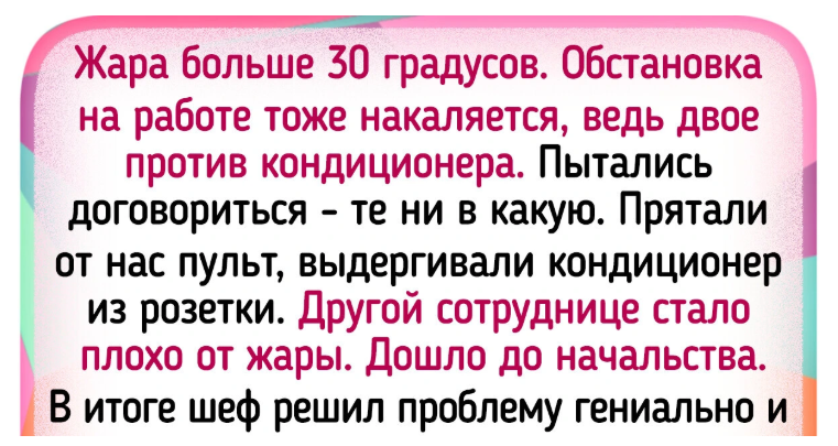- Жара больше 30 градусов. Обстановка на работе тоже накаляется, ведь двое против кондиционера. Пытались договориться — те ни в какую. Прятали от нас пульт, выдергивали кондиционер из розетки. Другой сотруднице стало плохо от жары. Дошло до начальства. В итоге шеф решил проблему гениально и пересадил этих двух вообще в другой кабинет. В проходной полукоридор, где маленькое окошко, нет кондиционера. Там тесно, спиной к двери, народ мимо шныряет, рядом туалет еще, но они с начальством не спорят.