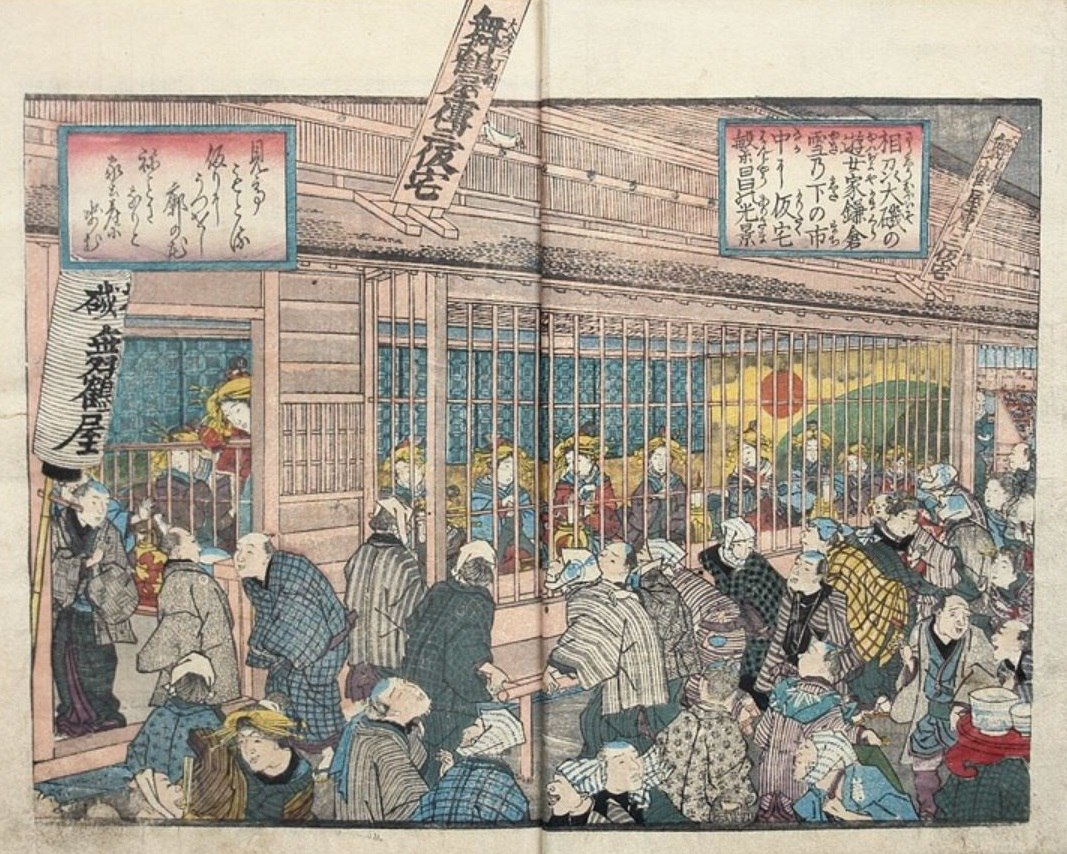 Приравненные к зверям в клетках, проститутки из дешёвых борделей Ёсивары сидели за деревянной решёткой, чтобы мужчинам было удобнее прицениваться и выбирать. Эти витрины назывались «харимисэ» и служили приманкой не только для потенциальных клиентов, но также для зевак и широкой публики. Главная улица, Наканотё, была усеяна такими «клетками» — символом престижа и местной достопримечательностью исключительно Ёсивары: в нелицензированных кварталах «харимисэ» не наблюдалось. Похотливые мужчины без всякого стеснения буквально прижимались лицами к решёткам и капали слюной, разглядывая красавиц, смирившихся со своей нелёгкой долей страданий в вынужденном секс-рабстве. Большинство этих женщин ещё совсем маленькими девочками были проданы в Ёсивару их собственными родителями из-за серьёзных финансовых проблем. И покинуть это место проститутки не имели права до окончания контракта, а периодические попытки побегов крайне строго наказывались. После принудительного открытия Японии (под дулами америк