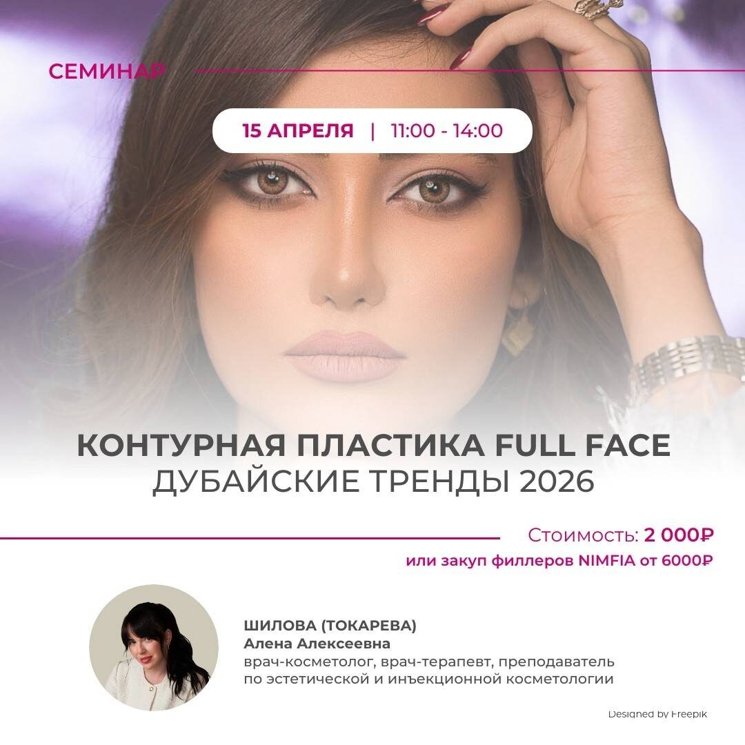 Семинар для косметологов-инъекционистов по современным методам контурной пластики лица с комплексным подходом Full face. Рассмотрены новейшие техники, материалы и тренды, включая акцент на естественность и минимальную инвазивность. Начало: 15 апреля 2026 11:00 Окончание: 15 апреля 2026 14:00 Стоимость: 6000.0 руб. Адрес: г Омск, ул Куйбышева, д 62 Организатор: https://vk.com/public165246881 Семинар «Контурная пластика Full face. Дубайские тренды 2026» Категория слушателей: косметологи-инъекционисты Дата и время: 15 апреля, 11.00-14.00 В программе: На семинаре будут рассмотрены современные методы контурной пластики лица с применением комплексного подхода Full face. Особое внимание уделено новейшим тенденциям и техникам, которые актуальны в Дубае в 2026 году: использование инновационных... #тело_косметология Узнать подробности, адрес или записаться на событие.