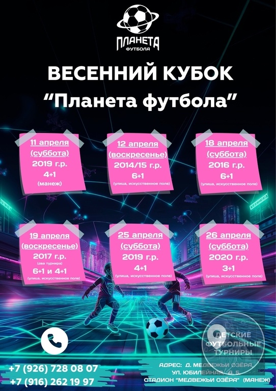 ! Как давно мы ждали игр на улице — и вот он, долгожданный футбольный апрель! Приглашаем вас на турниры в Медвежьих озёрах: искусственное поле, честная борьба и море эмоций!🏟😍 ⚡Возрастные категории: 2014/15, 2016, 2017, 2019, 2020 г.р. Собирайте команду и регистрируйтесь! Ждём вас на поле! 🐻❤ 📌Спортивная база «Медвежьи озёра», Московская область, Щёлковский район, деревня Медвежьи озёра, улица Юбилейная, строение 5 ❗Количество мест ограничено! До 5-6 команд в форматах 6+1. До 8-10 команд в форматах 4+1 и 3+1. 🔥МЫ ПРЕДЛАГАЕМ: ⚖Непредвзятое и независимое судейство 👌 Количество команд до 6-10 ⏱ Игровое время 17-20 минут/матч 🎤 Диктор на играх 📸 Фотоотчёт 📱 Крутое медиасопровождение 👩⚕ Медицинский персонал 🥇 Награждение всех участников соревнований 🔝 Награждение лучших игроков матча 🏆 Индивидуальные награды для игроков каждой команды 🔥ФОРМАТЫ: 3+1, 4+1 и 6+1 📲ПОДАЙ ЗАЯВКУ СЕЙЧАС — МЕСТА ОГРАНИЧЕНЫ! 📞 8 (926) 728-08-07 Алексей 📞 8 (916) 262-19-97 Олег 🔗 Следите