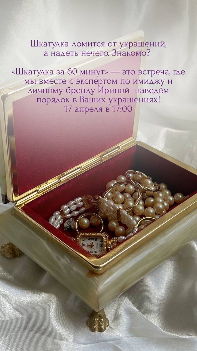 Встреча для наведения порядка в шкатулке с украшениями, включая разбор и консультации от эксперта по имиджу. Начало: 17 апреля 2026 17:00 Стоимость: 1900.0 руб. Адрес: г Омск, ул Ильинская, д 9 Организатор: https://vk.com/public170989447 У Вас тоже так? Шкатулка ломится от украшений, а надеть нечего. Серьги «никуда не подходят», кулоны «не к чему носить», браслеты потерялись на дне.. ❗️Проблема не в том, что мало украшений. Проблема в том, что мы перестали их замечать. Они есть, но не работают на нас - а могли бы. «Шкатулка за 60 минут» Встреча, где мы наведём порядок в украшениях. 17 апреля в 17:00. 900р • Разбор шкатулки и консультация в группе - 1900р • Личная консультация и советы с полным погружением от эксперта по имиджу и личному бренду - 5000р 🎁 20% на любую... #ремесло_рукоделие Узнать подробности, адрес или записаться на событие.