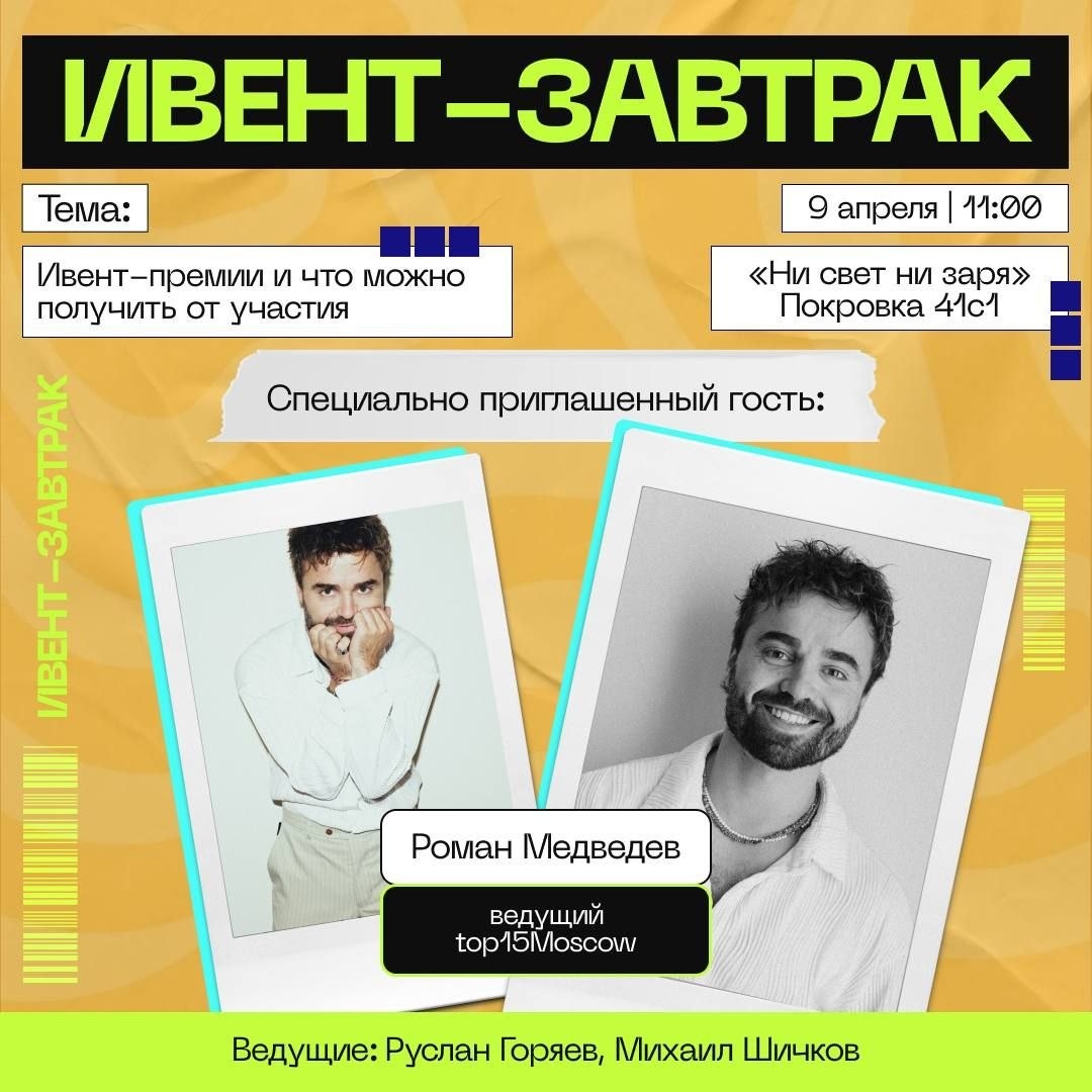 #Москва #офлайн ☕️Ивент-премии: что можно получить от участия в них☕️ Все мероприятия недели (с 6.04 по 12.04.2026) доступны по хештегу: #6апр_12апр26 ⏰ 11:00 📍 «Ни свет ни заря» Покровка 41с1 💰 Стоимость 2000 руб ❗️ Регистрация ИВЕНТ-ЗАВТРАК 9 апреля | 11:00 Тема: Ивент-премии: что можно получить от участия в них Специальный гость: ▫️Роман Медведев – ведущий, возглавивший в том году рейтинг TOP100AWARDS и тем самым попавший в TOP15MOSCOW Разберём на опыте: ▪️какие существуют премии ▪️окупается ли участие и продакшн заявки ▪️как это влияет на позиционирование ▪️и где грань между «надо участвовать» и «слив бюджета» Формат — круглый стол, можно задавать любые вопросы ❗️Всего 10 мест Стоимость — 2000 ₽ Завтрак включён 📌 Добавить в Google Календарь Афиша профессиональных мероприятий для ивентеров МероПриятели! ВК https://clc.to/oiKisw Дзен https://clc.to/P6N_4A
