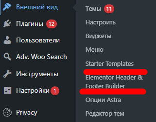 Как найти Хедер и футер в админке WordPress с плагином Elementor