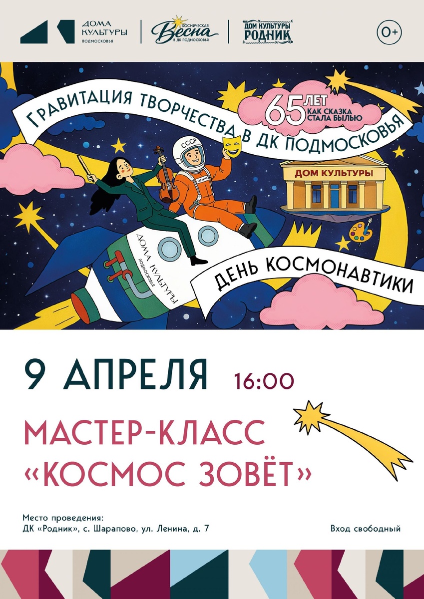 ✨ Творческий мастер-класс для детей "Космос зовет"🚀в с. Шарапово 🎨Будем рисовать планеты, космос, кометы - все что связано с космосом Присоединяйтесь 🪐 🚫 Возраст: 6+ 📆 09.04.2026 🕛 16:00 🏢 ДК «Родник» 📍 г.о. Чехов, с. Шарапово, ул. Ленина, д.7 🪙 Вход свободный❗️ ⭐Поддержать канал голосом ✅ Мероприятия Чехов https://dzen.ru/id/66cc4b48e9ef144699238a51 https://vk.ru/chekhov_events http://dzen.ru/chekhov_events