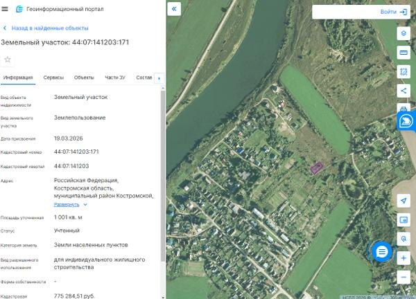 Название: КН 44:07:141203:171 площадью 1001 кв.м., местоположение: Костромская область, Костромской район,с