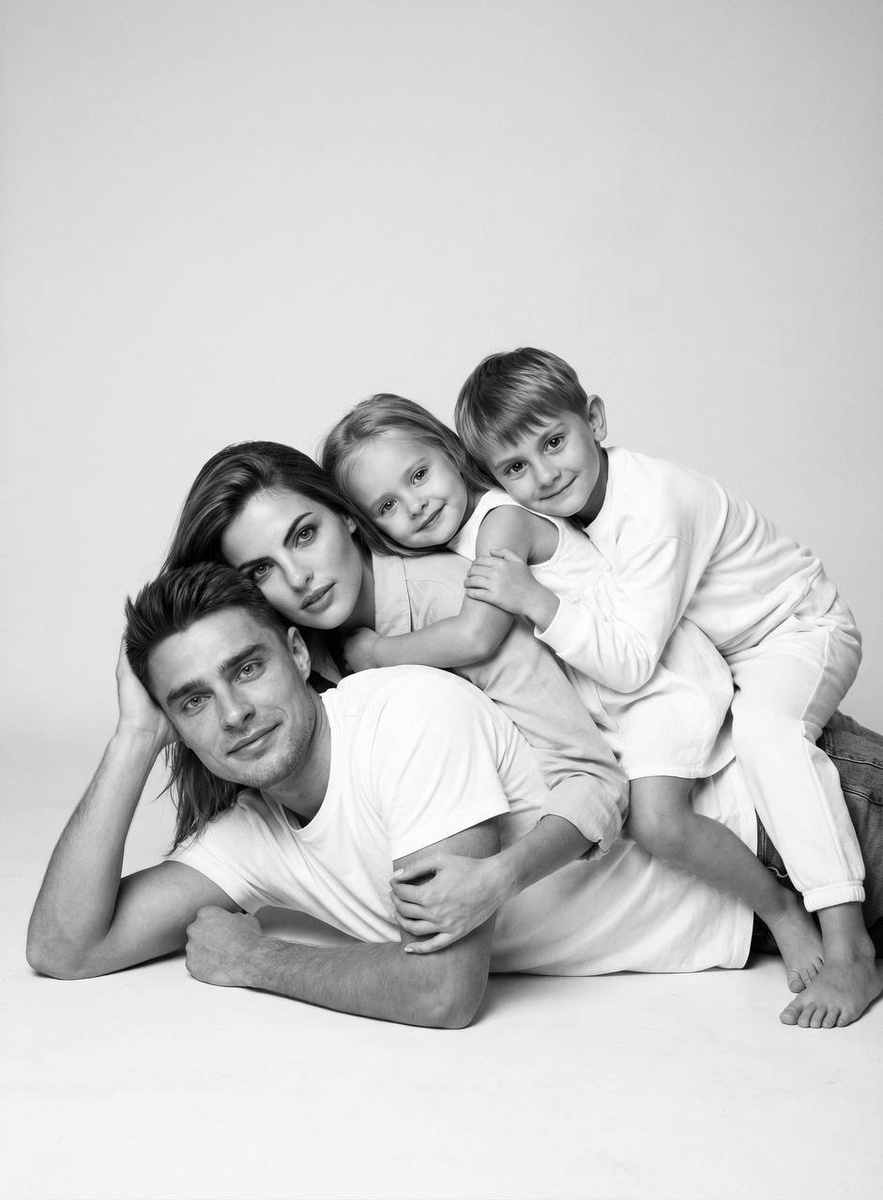 1) Заходим в БОТ ВК 2) Жмем Выбор модели => Nano Banana PRO/Nano Banana 2 3) Добавляем свой фото (важно фото БЕЗ ретуши и любой обработки и фильтров), вставляем этот ПРОМТ: Черно-белая студийная семейная фотография, минималистичный fashion-editorial стиль. Светлый однотонный фон, мягкий рассеянный свет + эффект вспышки, лёгкое пленочное зерно и винтаж. Горизонтальная уютная композиция, сильная эмоциональная связь. Мужчина лежит на боку, опираясь на руку и слегка улыбается; на его спине женщина, обнимает его, смотрит в камеру; сверху дети обнимают маму, искренняя улыбка. Простая светлая одежда без принтов, у одного мальчика белый спортивный костюм, у девочки белое платье.