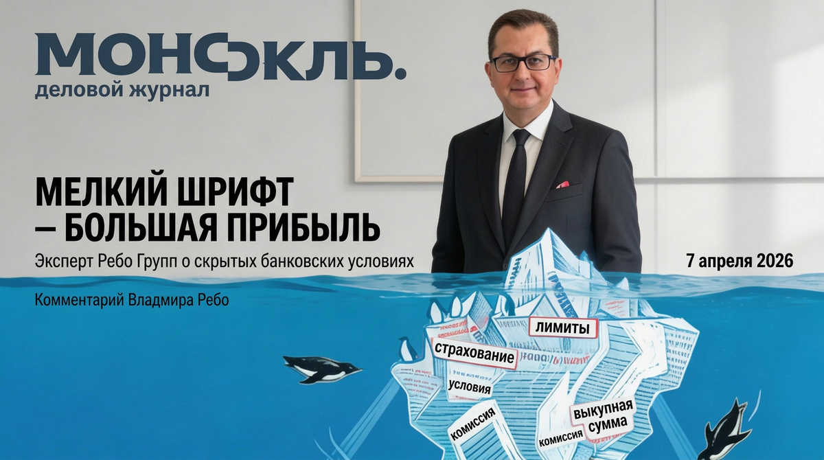 3. Что делать, если вы уже столкнулись с одной из этих схем. Что это значит для вас: банк может формально не нарушать закон — и при этом скрыть от вас ключевые условия договора. Знание конкретных норм — единственная реальная защита. 6 апреля 2026 года журнал «Монокль» — один из ведущих федеральных деловых изданий России — опубликовал материал «Мелкий шрифт — большая прибыль» (№15, 1429). Тема: как цифровизация помогает банкам зарабатывать на невнимательности клиентов, оставаясь в рамках закона. За экспертным комментарием редакция обратилась к учредителю юридической компании Ребо Групп - Владимиру Ребо. Его позиция вошла в материал несколько раз