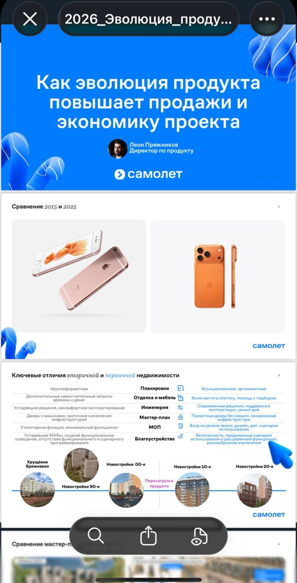 ). Итак, как поменялся айфон 17 по сравнению с айфоном 6 в недвижимости? 1. В семейную ипотеку можно засунуть и ремонт. 2. Дворы без машин, но только в дорогих проектах, потому что с дворами без машин надо строить парковки, о как. 3. Площади квартир уменьшились. Как говорит Леон, квартиры теряют «лишние метры» и улучшают функциональность. Все остальное, изложенное в презентации, это мечты мечты. Даже в Москве эта прекрасная продуктовая эпоха с рощами, скверами, бульварами, историей места, сценарным подходом для жизни и работы, это отдельные редкие элементы некоторых проектов. Но если Леон имеет в виду запросы ЦА исключительно, а не сами изменения продукта, то безусловно, в Москве потребитель уже хочет айфон 17, а вот в регионах, все еще, готовы на 6й, причем по цене 17го.