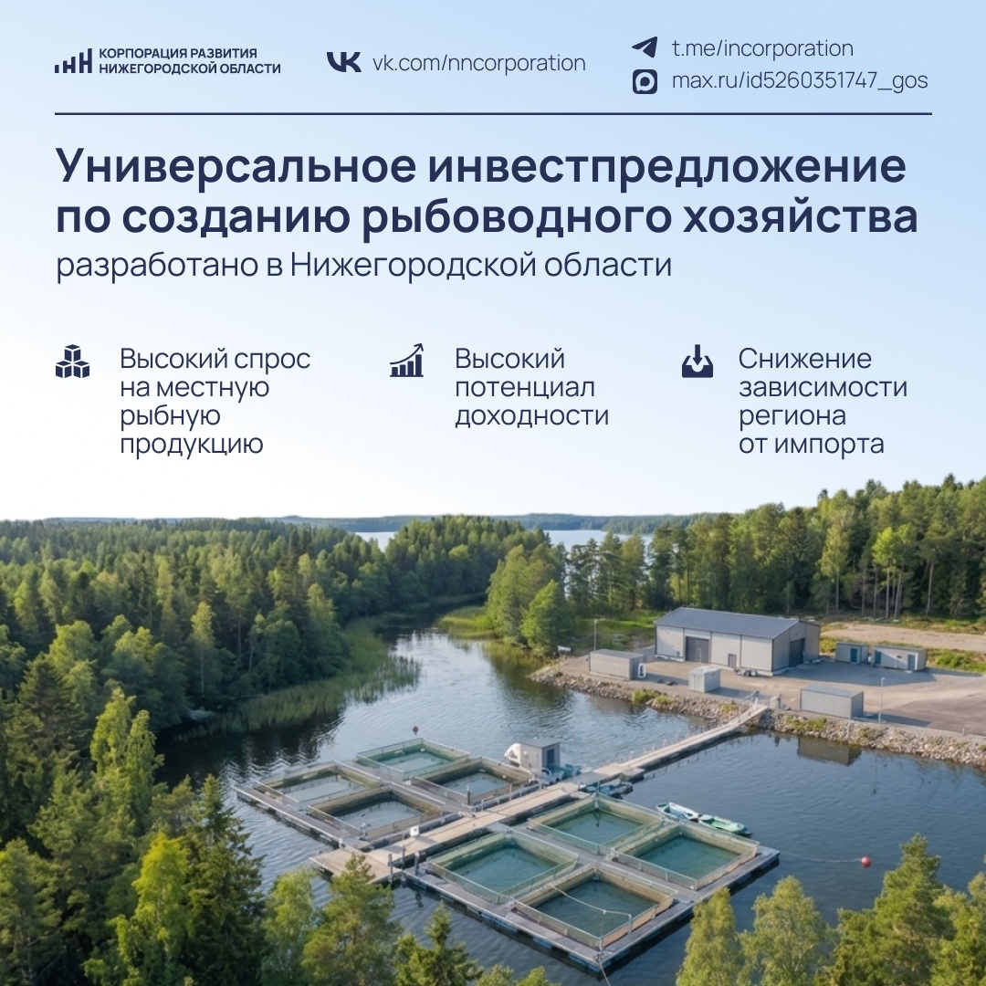 Проект предполагает создание хозяйства с целью круглогодичного выращивания рыбы и возможностью предоставления услуг платной рыбалки. Минимальный объем инвестиций в создание такого объекта составляет 16,7 млн рублей, срок реализации – от 23 месяцев. «Разведение рыбы – одна из самых актуальных инвестиционных ниш региона. Помимо реализации продукции, инвестпредложение предполагает и предоставление услуг платной рыбалки, которая также набирает популярность. Желающие реализовать такой проект могут обратиться в Корпорацию развития, наши специалисты проконсультируют по всем возникающим вопросам и сопроводят проект вплоть до ввода предприятия в эксплуатацию», – сказал генеральный директор Корпорации развития Нижегородской области Игорь Ищенко. Ознакомиться подробнее с инвестпредложением можно на инвестпортале.
