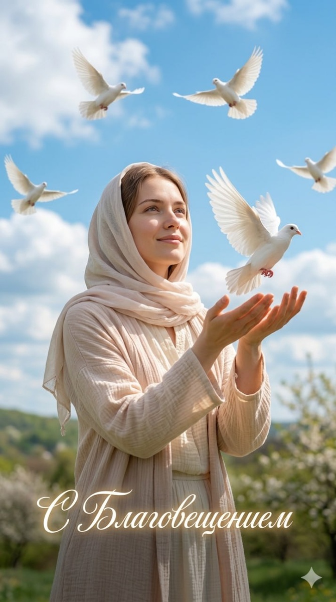 Промпт - открытка - Благовещение Пресвятой Богородицы А еще сегодня, 7 апреля - Благовещение Пресвятой Богородицы Вертикальная праздничная открытка к Благовещению. Строго перенести внешность с загруженного фото: черты лица, пропорции, форма глаз, бровей, носа и губ, цвет и длина волос, текстура кожи — без каких-либо изменений. Максимальная узнаваемость персонажа. Портрет в три четверти, голова и верхняя часть тела. Персонаж одет в мягкую светлую одежду пастельных бежево-кремовых оттенков. Голова покрыта светлым платком, драпировки мягко обрамляют лицо. Руки вытянуты вперёд на уровне груди, ладони открыты и слегка приподняты — с них взлетает белый голубь. Несколько белых голубей парят вокруг: справа, слева, выше. Выражение лица умиротворённое и возвышенное. Взгляд направлен вверх или вдаль. Лёгкая мягкая улыбка. Фон — чистое яркое голубое небо с лёгкими белыми облаками. В нижней части кадра размытая зелень или природный пейзаж. Освещение мягкое, естественное, дневное. Солнечный