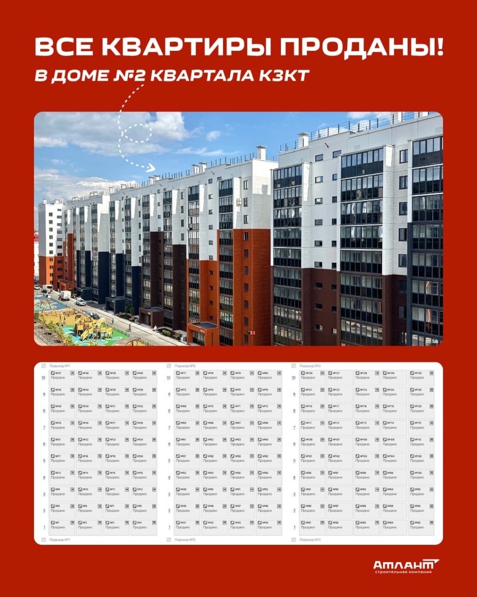 ! В доме №2 Квартала КЗКТ не осталось свободных квартир Последние доступные планировки квартир в соседних домах смотрите на сайте: kzkt.atlant45.ru Поможем с одобрением ипотеки и запишем на индивидуальную экскурсию — звоните: 225-100. Если не грузится, подписывайтесь: Канал ВК или Канал в Мах
