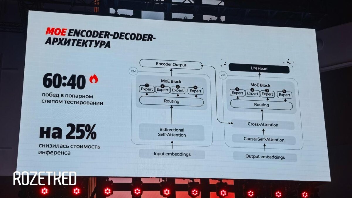 И последний анонс с полей конференции «День Поиска» «Яндекс» показал новую архитектуру ИИ-моделей, которые используются в поисковой системе. В основе модели — архитектура Encoder-Decoder, где одна часть анализирует инфоконтекст, а другая генерирует результат. Для повышения эффективности в неё добавили слои Mixture of Experts. Раньше такой подход описывался только в научных статьях. Новая архитектура побеждает 60:40 в попарном сравнении, а её инференс (количество вычислений для обработки одного запроса) — на 25% эффективнее. 💼 Rozetked | Подписаться