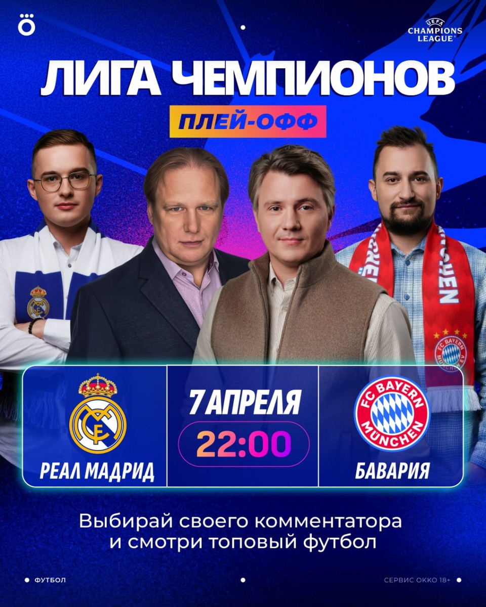 ! 🤩 В 22:00 включай матч «Реал» – «Бавария», а затем выбирай своего комментатора: ⚽ Никита Шалимов, болельщик «Реала» ⚽ Александр Еремиев, болельщик «Баварии» 🎙 Владимир Стогниенко, классический комментарий 🎙 Алексей Золин, тифлокомментарий Не забывай и про традиционный интершум, если хочешь насладиться чистым звуком футбола! 🙌🏻 😀 VK Okko Cпорт | MAX Okko Спорт