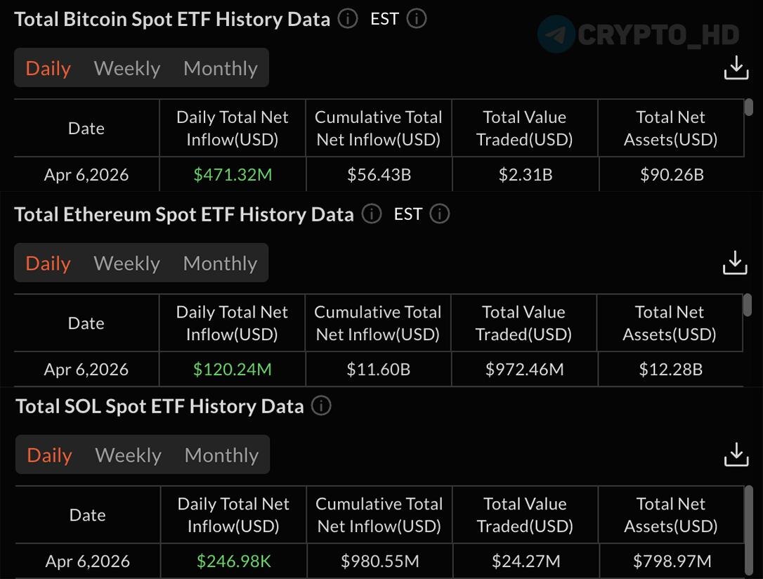 ) Финпотоки за вчерашний день: ▫️#BTC = +$471,320,000. ▫️#ETH = +$120,240,000. ▫️#SOL = +$246,980. ▫️#LINK = +$558,380. ▫️#XRP, #AVAX, #LTC, #DOGE, #HBAR, #DOT= $0. Crypto Headlines