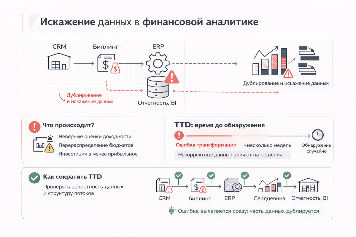 Представьте ситуацию. У вас есть отчеты, дашборды, цифры обновляются каждый день. Все выглядит стабильно. Доход растет, показатели ровные, команда уверена - бизнес под контролем. Но есть один нюанс. Все это время цифры могут быть… неверными. И вы об этом даже не знаете. В одной B2B-компании данные собирались из нескольких систем: CRM, биллинг и ERP. Все это автоматически стекалось в BI-систему, где формировалась управленческая отчетность. Процесс был полностью настроен: Руководство компании принимает решения на основании цифр. В одном из потоков данных появилась небольшая ошибка - некорректная трансформация. Часть данных начала дублироваться, другая часть - агрегироваться неправильно. Но система продолжала работать: отчеты строились, метрики считались, графики выглядели «логично».