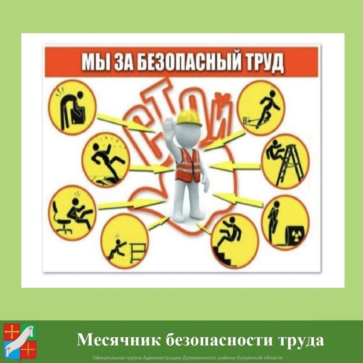 ! С 1 по 30 апреля на территории нашего муниципального образования проводится Месячник безопасности труда. Организации должны руководствоваться Методическими рекомендациями по проведению Месячника безопасности труда в организациях, расположенных на территории Калужской области, от 11.02.2013 № 26 - П (в редакции Приказа Министерства труда и социальной защиты Калужской области от 24.03.2016 № 289-П). Информация об итогах проведения месячника направляется в администрацию Дзержинского округа по форме приложения № 1 к Методическим рекомендациям в срок до 15 мая 2026 года по адресу: г.Кондрово, пл. Центральная, д.1; на электронную почту: adzerg@adm.kaluga.ru, контактный телефон 3-64-48.