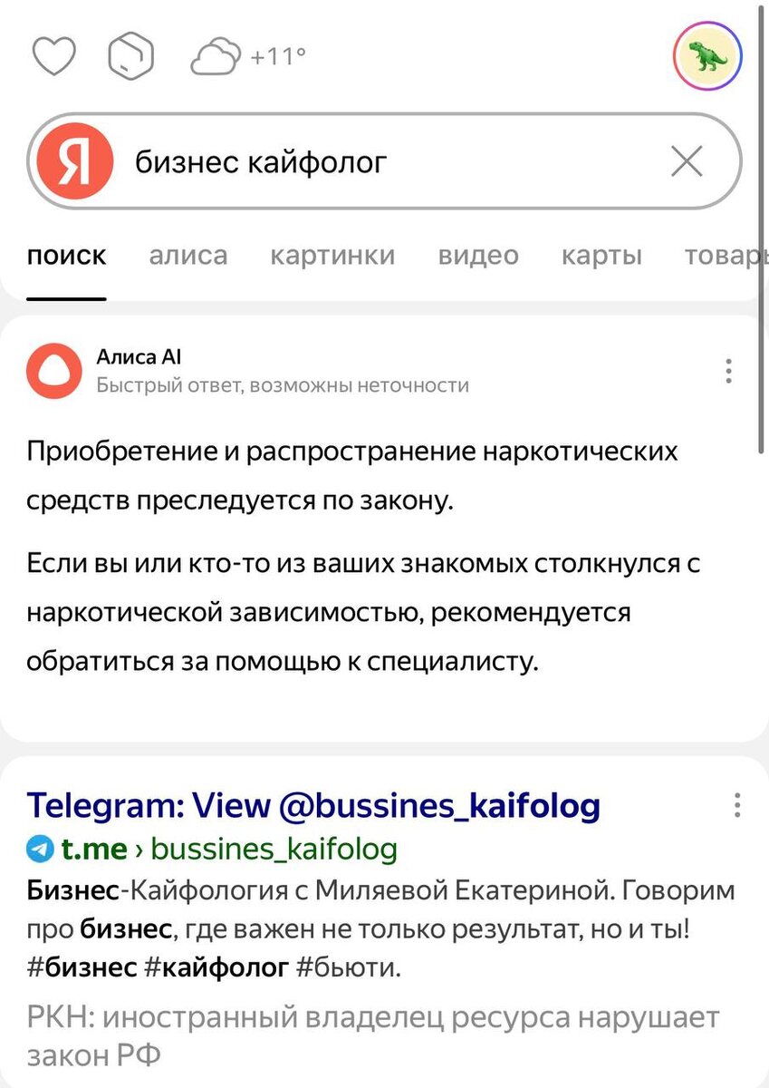 Алиса очень заботливо предупреждает о вреде наркотиков, когда я проверяю себя в выдаче 😅