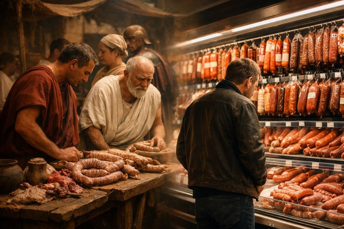 Можно проследить историю ее возникновения до Древней Персии. Здесь мясо просто солили, а потом сушили на солнце. Оно теряло влагу, становилось более жестким и стойким к внешним воздействиям. В сушеном виде продукт можно было хранить довольно долго. Его брали в военные походы и употребляли в пищу мирные жители. Стоит ли считать сушеное мясо колбасной продукцией - вопрос неоднозначный. Как минимум, так появилась бастурма. Точный год назвать невозможно, но продукт, похожий на бастурму, использовали в Персии, Китае, Вавилоне в 500 году до н.э. В Средневековье колбасы стали популярными по всей Европе. Рецепты варёных и копчёных колбас передавались из поколения в поколение, а на Востоке начали готовить мясные изделия с различными специями, что сделало их ещё более необычными и вкусными. С развитием технологий в XIX веке производство колбас стало промышленным. Появление машин, новых оболочек и массовое производство сделали колбасу доступной в каждом магазине. Сегодня колбасы существуют в р