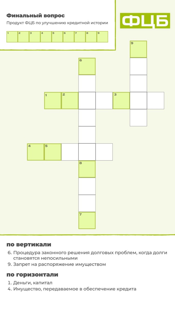 Знаете этот момент, когда банки говорят «скоринг», «БКИ», «рейтинг», а ты просто хочешь узнать — дадут кредит или нет? 🤯 Мы решили: хватит страданий. Давайте поиграем! 🕵️♂️ Перед вами кроссворд на тему кредитов, долгов и банкротства. Разгадаете все слова — а из выделенных жёлтым клеток соберётся секретное слово. Оно связано с продуктом ФЦБ, который возвращает доступ к деньгам. 🎁 Подсказка: секретное слово из 9 букв. Кто угадает первым — тому респект и виртуальный кредитный рейтинг 999 😎 Хотите еще подсказку? Переходите на сайт https://vk.cc/cVA9bb А если ваша реальная кредитная история хромает — не гадайте. Напишите «КРОССВОРД» в сообщения, и мы бесплатно проверим, что с ней не так.