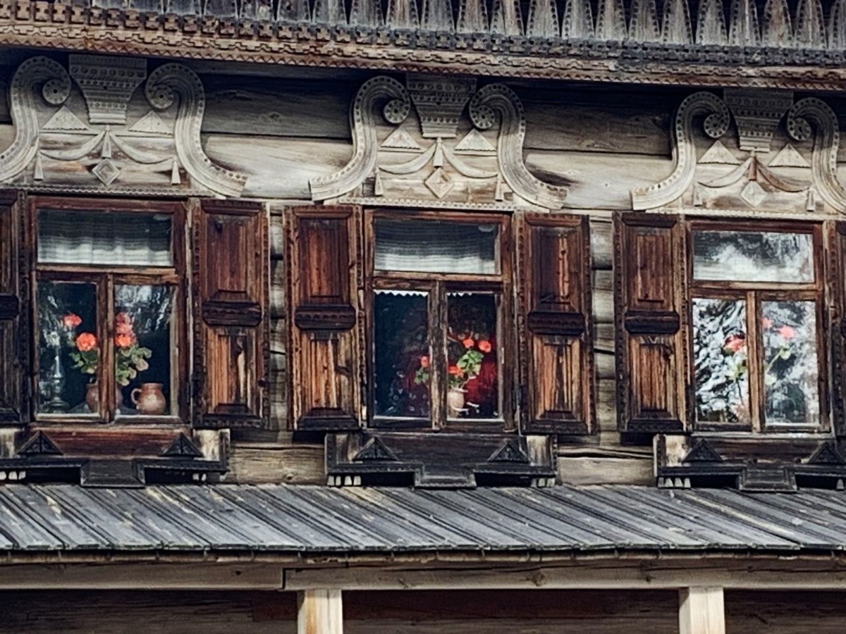 Снаружи брёвна потемнели до серебристо-серого, почти графитового цвета. Солнце уже не блестело на них, только подчёркивало узор глубоких трещин и сучков. Крыша из старого железа проржавела у конька. Резные наличники на окнах, когда-то яркие, теперь выцвели до цвета сухой травы, но их узор всё ещё был виден: круглые «солнышки» и завитки, оберегающие сон. Половицы скрипели и прогибались под ногой — они выложены широкими плахами без краски, затёртыми до блеска за столетие шагов.