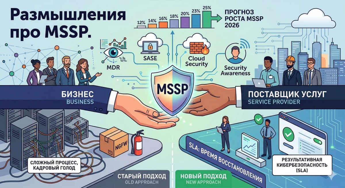Одним из преимуществ платного внешнего сервиса кибербезопасности является то, что вам становится всё равно, каким конкретным WAF, Anti-DDoS или NGFW пользуется поставщик. Вы просто получаете нужный вам SLA. Именно это и называется результативной кибербезопасностью — достижением нужного бизнесу SLA. Бизнес устал от фразы, что безопасность — это процесс; ему не нужно "снова и снова продлять подписку на SIEM", а ему нужно "знать время восстановления после атаки". Раньше MSSP был редкой услугой. Я помню, как мы начинали в 2008 году в IBM Global Technology Services с управления одним IPS в одном из телекомов через Virtual SOC. Сейчас MSSP востребован по трём причинам: — Кадровый голод: нанять своего специалиста по ИБ за 200–300 тысяч рублей — дорого, а за 100 тысяч — невозможно. Проще купить сервис. Кто-то делает insource, кто-то outsource. — Импортозамещение: заказчикам страшно внедрять незнакомые российские NGFW или SIEM. Они говорят: "Возьмите это на поддержку сами, я просто хочу, чтоб