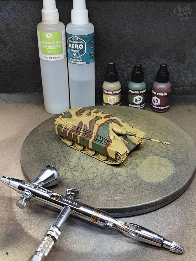 Нанесение камуфляжных линий. На данном этапе мягкость триггера проявилась во всей красе, палец меньше устает. За одно опробовал встроенный ограничитель подачи воздуха, работает как положено. Можно на ходу менять давление без регулировок на компрессоре. Надо только докупить защитную коронку в виде рогатки, чтобы и игла была под защитой и контролировать её было проще. Благо она есть в продаже. Промокод на скидку 10% в официальный магазин на озон: GHLRR4F31DC1