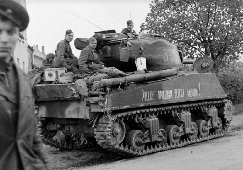 Представьте себе картину: солдаты РККА, как настоящие герои, мчатся на американском танке Sherman M-4, который они получили по ленд-лизу