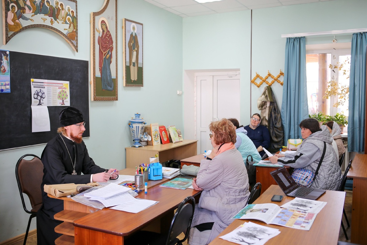 ? 4 апреля 2026 года В Лазареву субботу, накануне Страстной седмицы и двунадесятого праздника Входа Господня в Иерусалим, в Успенском монастыре Новомосковска прошла очередная встреча участников родительского клуба - родителей воспитанников воскресной школы, стремящихся наполнить жизнь своей семьи в дни Страстной седмицы истинными смыслами и прожить этот период церковного года вместе с Церковью. Встречу провели насельник Свято-Успенского монастыря иеромонах Георгий (Пименов) и руководитель родительского клуба Ольга Ивановна Ефимова. В ходе работы участники говорили о важности и значении детских воспоминаний, которые дети получают в семье, в период подготовки к православным праздникам. Именно эти воспоминания в жизни человека становятся первым кирпичиком в фундаменте зарождения православных ценностей и семейных традиций, обеспечивают связь поколений в передаче основ веры. В подтверждении этой мысли, вниманию родителей были представлены произведения русской классической литературы для
