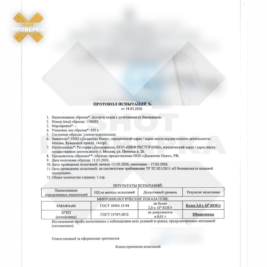 SHOT ПРОВЕРКА взяла пробы нескольких позиций из меню и отправила их в лабораторию. Результат: почти во всех блюдах зафиксировано превышение по микробам, а в части из них обнаружена кишечная палочка. Рассказываем, какие позиции не прошли проверку: — Ассорти пхали с рулетиками из баклажанов: превышение микробов в 15 раз и кишечная палочка. — Тёплый салат с курицей и шампиньонами: превышение микробов в 7 раз и кишечная палочка. — Сациви из курицы: превышение микробов в 4 раза. — Запечённые шампиньоны с сулугуни: превышение микробов почти в 4 раза. Даже после термической обработки блюда не проходят по нормам. Как выглядит кухня, на которой это готовят, и что ответили в ресторане — смотрите в нашем выпуске.