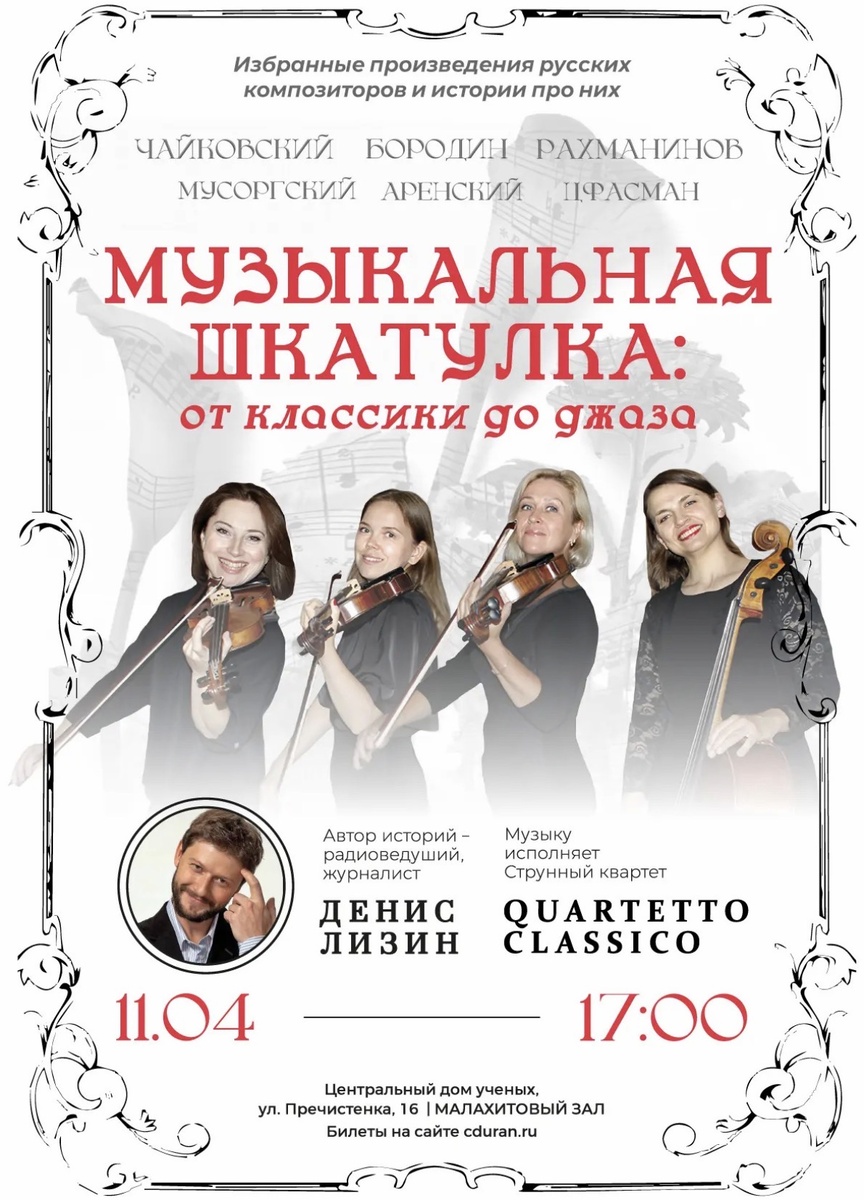 11 апреля в 17:00 Дом учёных приглашает на особенное мероприятие в Малахитовом зале по адресу Пречистенка, 16. Знаменитый проект «Музыкальная шкатулка: от классики до джаза» представит струнный квартет Классик, который погрузит слушателей в мир русской музыкальной истории. Исполнителями станут лауреаты международных конкурсов: Диана Кемельман и Дарья Куколева (скрипки), Александра Марутаева (альт), Екатерина Досина (виолончель). Особым гостем вечера станет журналист Денис Лизин, известный по работе на «Радио 7 на семи холмах». Он выступит в роли рассказчика, оживляя истории великих русских композиторов.